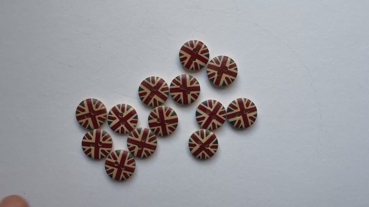 15mm Wooden Union Jack Buttons, UK Flag Design, 2 Holes, Pack of 10